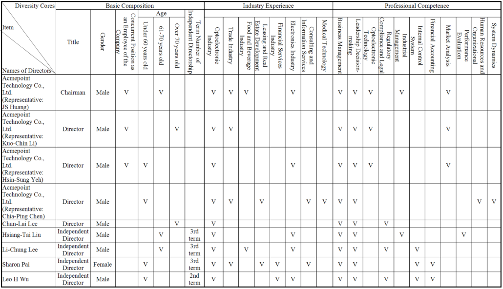 | Chairman | JS Huang | Bachelor of Industrial Management, National Cheng Kung University | Chairman of Acmepoint Technology Co., Ltd. Chairman of Acme Green Biotech Inc. Chairman of Ares Optronics Co., Ltd. Director of D8AI Inc. Chairman of Y Cypress Management Consultants Co., Ltd. Chairman of Acmepoint Technology Co., Ltd. Supervisor of Soaring Technology Co., Ltd. CEO of our company |